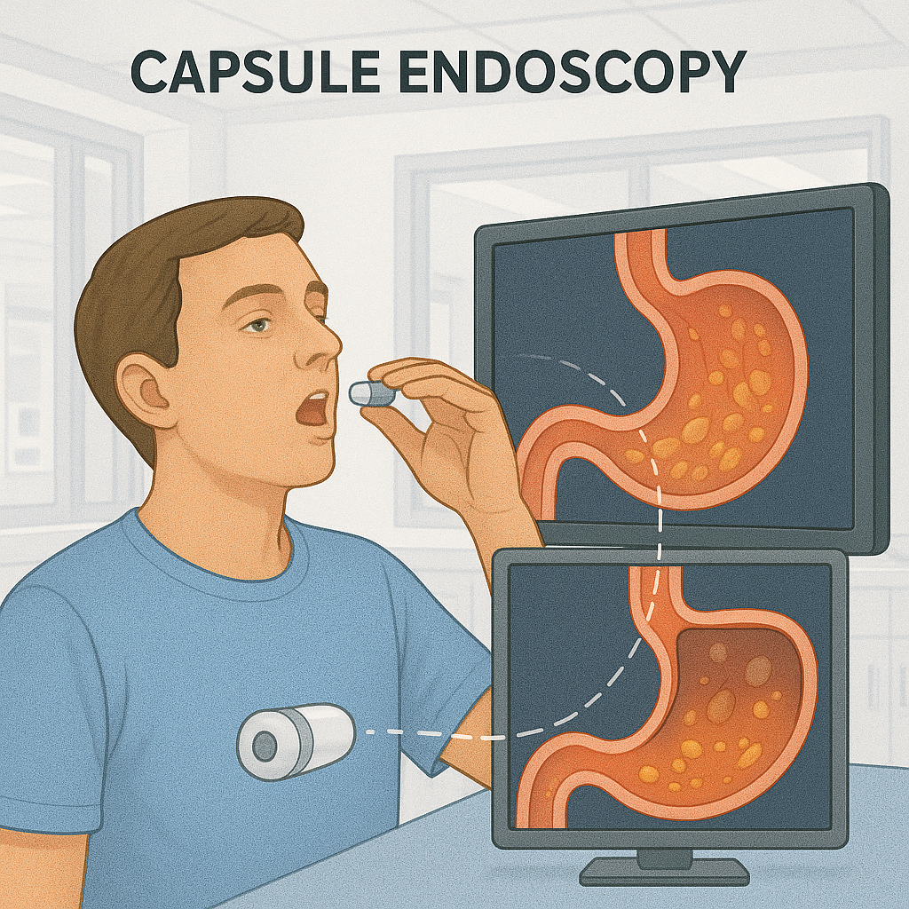 Capsule endoscopy enables us to visualise the entire digestive tract by the patient swallowing a capsule.