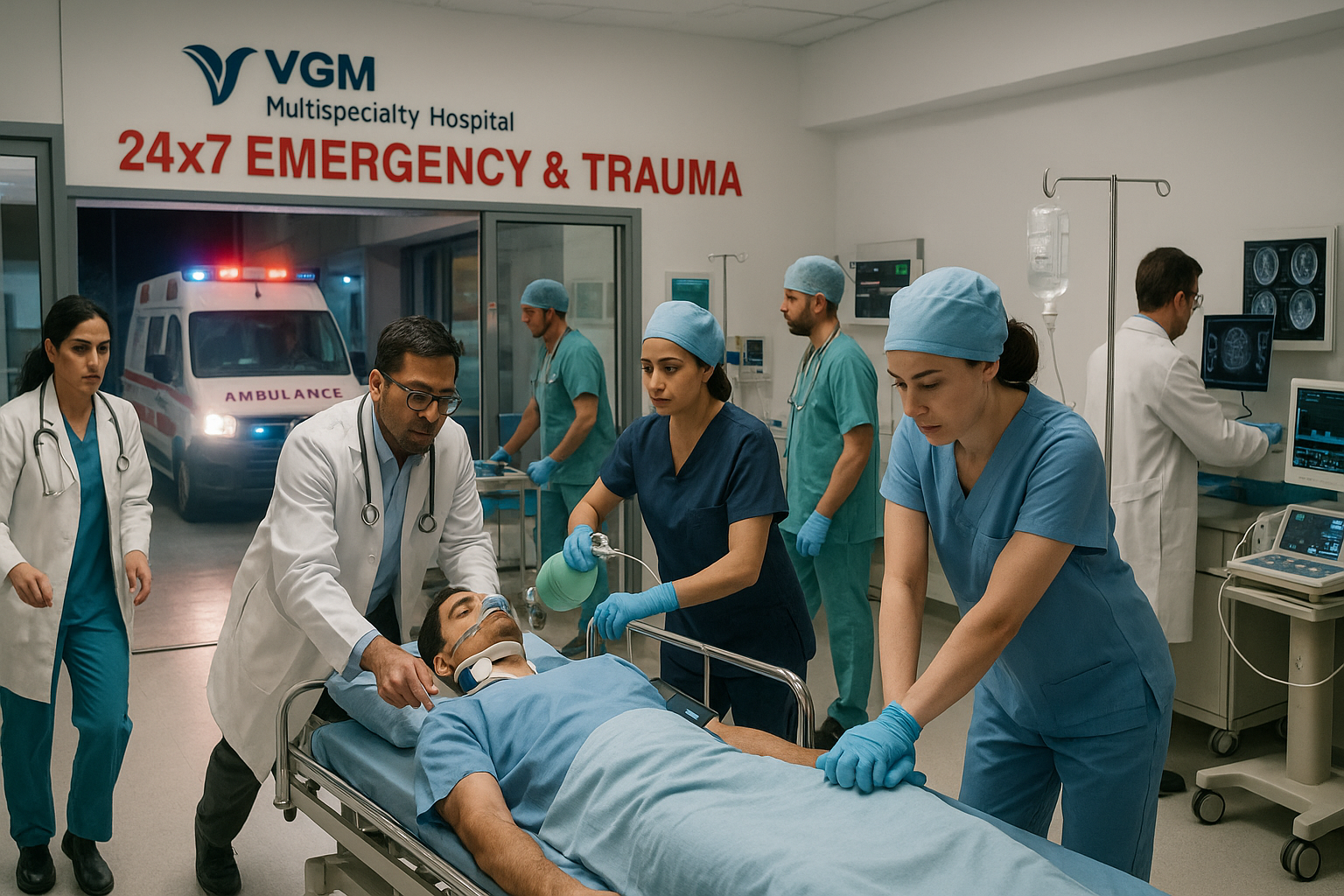VGM Multispecialty Hospital provides 24x7 trauma and emergency care with advanced life support, ICU access, and ambulance response.